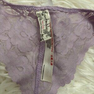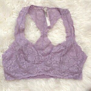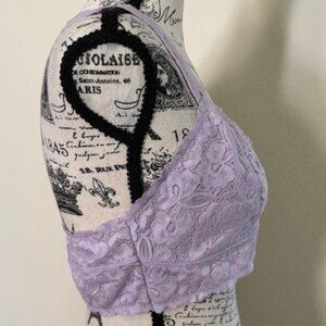 Soft and stretchy floral lace racerback bralette with mesh lining and scalloped edges. Lilac purple lace fabric is lined. Bralette is new with a re-tag.