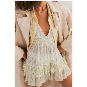 Intimately Free People Happy Hour Mini Slip Womens XL Ivory Green Tiered Smocked