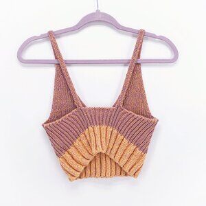 A charming Free People bra top features a deep V-neckline and a sleeveless design, crafted in a pink & peach ribbed knit. Its cropped length and fitted silhouette make it perfect for a casual summer look.