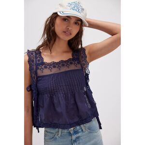 Guaranteed 100% Authentic & Never Before Worn Description: * Shapeless silhouette * semi-cropped * pintuck pleats at bust * embroidered lace trim throughout * thick straps * wide self-tie sides Measurements/item Details * Size - Large * Bust - It can Fit 37"-38"(14"across (Laying flat) * Length - 23"approx * Color - Navy * Fabric - Cotton Please note: This Item Is Missing Tags.