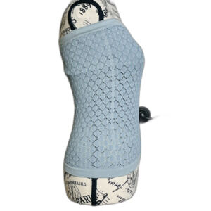 Excellent condition. Very stretchy. See photos for measurements. Color is a blueish gray.