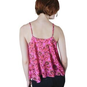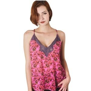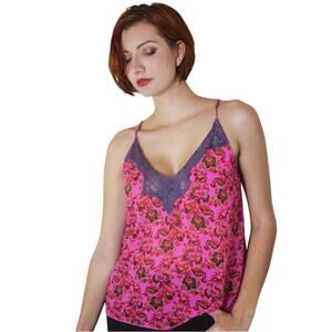 - Bright pink floral lightweight camisole from Free People with lavender lace detailing.