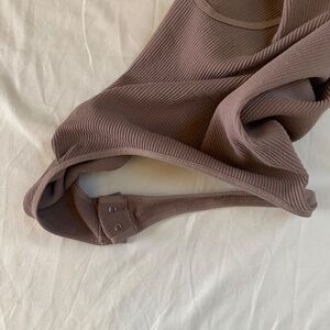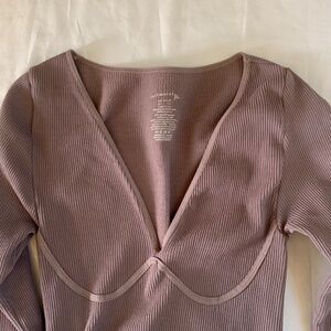 Intimately Free People long sleeve snap-closure bodysuit in a soft mauve hue.