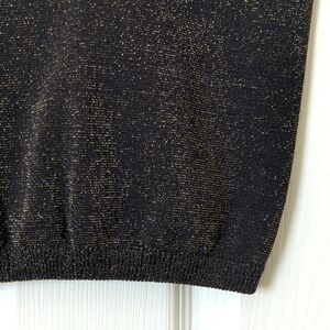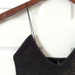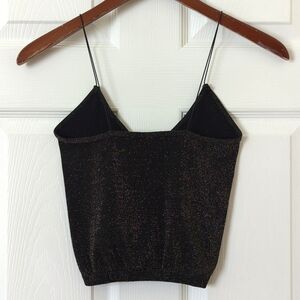 This top combines the comfort of a bralette with the look of a camisole. This brami features a sleeveless silhouette with skinny elastic spaghetti straps, a scooped neckline, and a cropped length with ribbing around the hem. It is black in color with a gold metallic lurex knit that makes it glimmer. It is lightweight, thin, and breathable with a flattering form fitting silhouette. Perfect for Spring and Summer nights out, pair with a black mini skirt and heeled sandals for a super cute look! High quality!