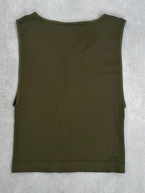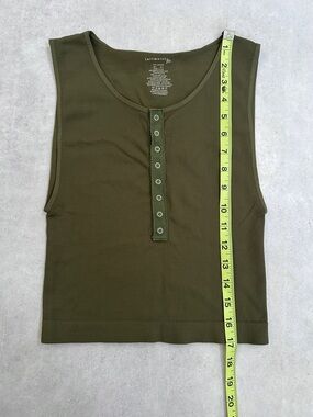 Soft, stretchy ribbed tank from Intimately Free People in a versatile olive green. Features a flattering scoop neckline with snap-button henley detail and a slightly cropped fit. Perfect for layering or wearing on its own.