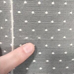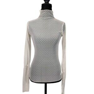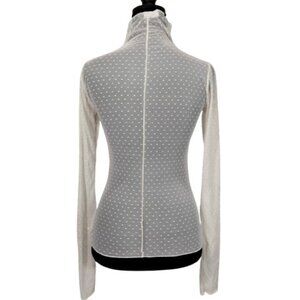 Has some "fuzzy" dots but not very noticeable.The Intimately Free People On the Dot Swiss Layering Top in Love Dove White is a stylish and versatile blouse designed for women. Featuring a high neckline, long sleeves, and a pullover closure, this top is perfect for casual occasions and can be worn in the summer, fall, or spring. The polka dot pattern with embroidered accents gives it a bohemian and retro vibe, while the lightweight and stretchy mesh fabric ensures comfort and ease of movement. Machine washable and in size XS, this blouse is a must-have addition to any wardrobe for those who appreciate a blend of vintage and contemporary styles.