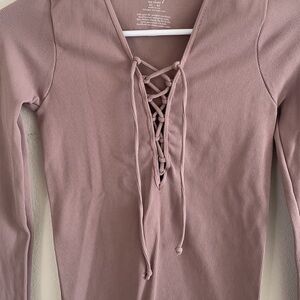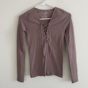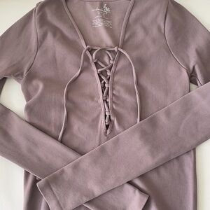In good like new condition lace up long sleeve from intimately free people, muave color ribbed stretchy material Nylon / spandex