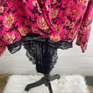 Intimately Free People Elsa bodysuit size medium. Pink floral print polyester body with black lace nylon/Elastane bottom. Collard plunging neckline wrapped silhouette fun pink floral print long sleeves. Lace bottom with scalloped trim Snap closures on the gusset. No holes or stains.