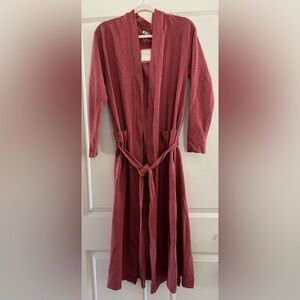 This maxi-length cardigan from Intimately by Free People is crafted from a soft cotton with a terry lining. It features long, drop-shoulder sleeves, patch pockets, a relaxed fit, and a self-tie waist belt secured and detachable by two small buttons on the center back of robe.