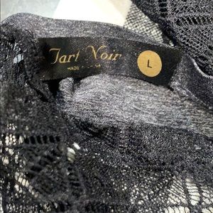 NWOT! Tart Noir size Large pair of black/ pair of black/gray. 43% nylon 41% polyester 16% spandex. Lace front very cute. Tag on Panties faded I’ve had these stored during my moves but the Panties are new and never been used.