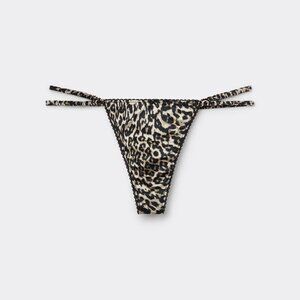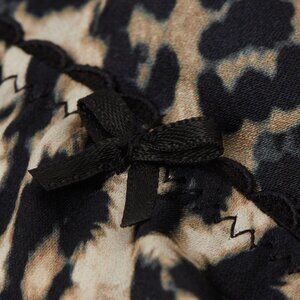 Light stretch silk satin thong with animal print. Small bow trim at the center of the waistband.