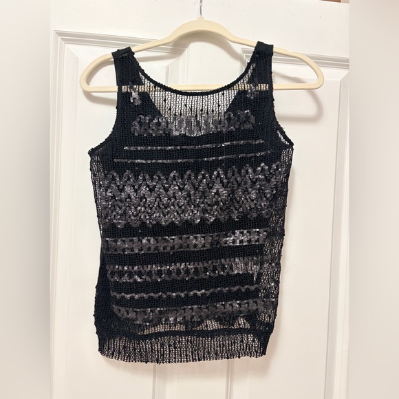 Elegant black top featuring shimmering silver sequins. Ideal for evening wear. Great condition