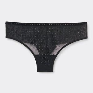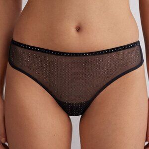 Brazilian in soft stretch tulle embellished with hematite colored micro-rhinestones. Soft, velvet-like stretch trim with hematite colored rhinestones. The back is lined with tulle, seamless and elastic-free to guarantee maximum comfort.