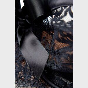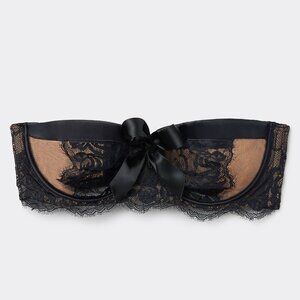 Bandeau bra with balconette styling made with a refined Chantilly-inspired lace combined with tulle and elegant satin trim. Romantic and mischievous removable bow in the center of the bust. Ideal for those looking for a sensual and feminine bandeau for a special occasion.