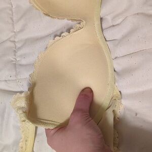 Gorgeous pale lemony yellow mesh and white floral lace wireless bra. Substantial padding for a push up effect. Only worn a couple of times as the band was always too big for me. Gives great cleavage and really is one of the prettiest bras I've owned.