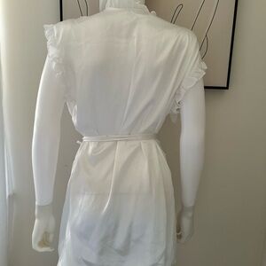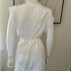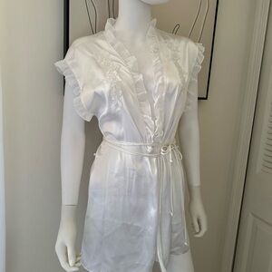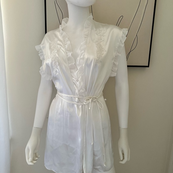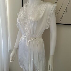 Chic cream kimono with ruffled trim. Includes a stylish tie belt.