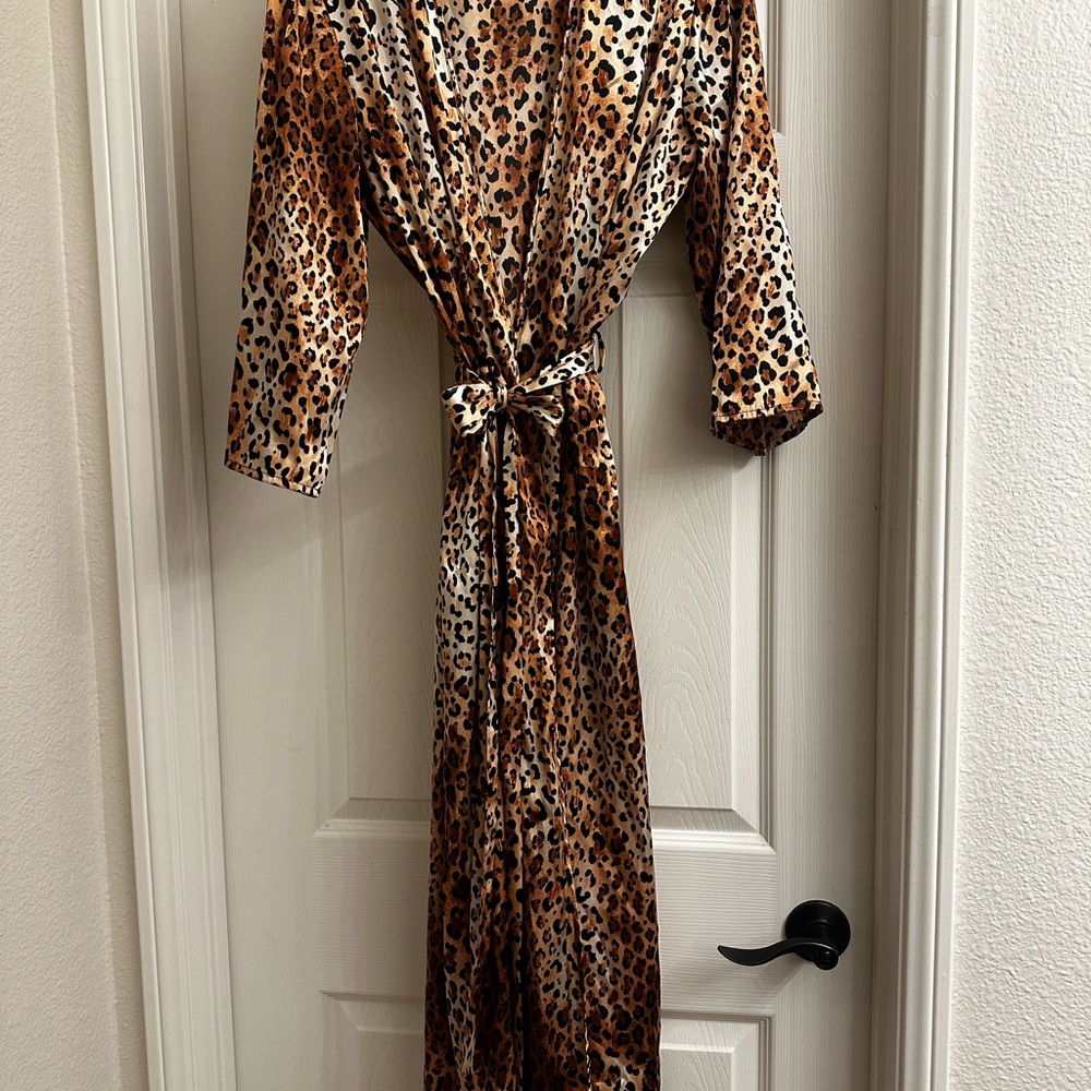 Chic leopard print robe. Smooth satin texture. Perfect for lounging.
