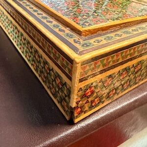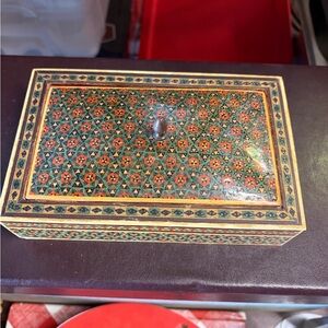 Beautiful box with intricate geometric patterns. Features a mix of green, red, and black colors. measurement is 7 x 4 1/2.