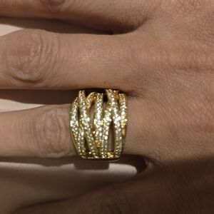 This exquisite 21kgp Duabi jewelry gold ring showcases a multi-layered design with intertwined bands, creating a captivating woven pattern. The textured surface is adorned with small, shiny gemstones that add a touch of sparkle and elegance. Perfect for making a statement, this ring embodies luxury and sophistication.