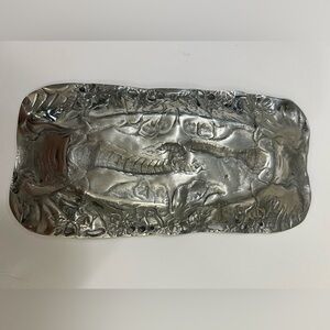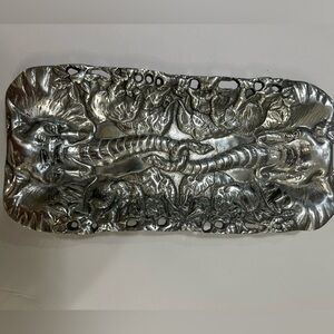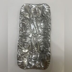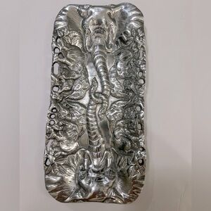 Stunning silver tray with detailed elephant design. Ideal for decor.