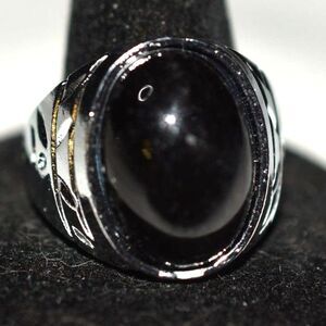 Intriguing Aztec Design Silver Tone Band Black Smooth Oval Stone Sz 11 & 13 Ring