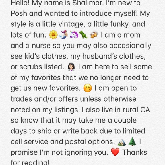 Welcome to Poshmark! If you have any questions please feel free to message me! Wishing you great success-Happy Poshing! It’s a great community! Warm Regards, Aimee ✨🌙