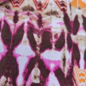 Vibrant button-up shirt with a striking pattern. Features shades of pink, orange, and deep burgundy. Perfect for adding a pop of color to your wardrobe.