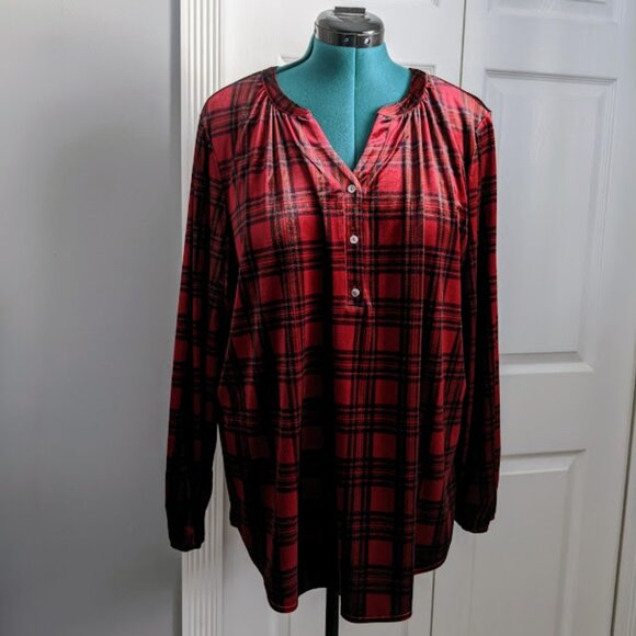 Intro Red Christmas Tartan Plaid Velvet Velour Popover Blouse XL NEW Festive