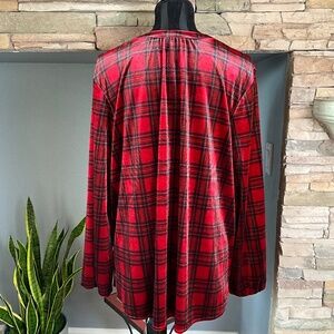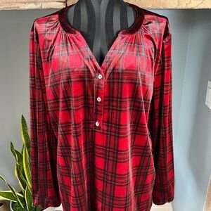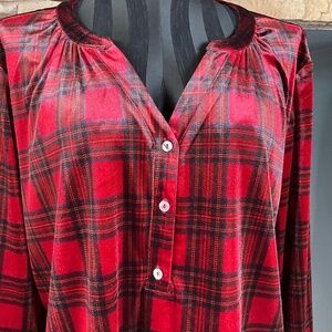 Intro Stretch Velvet Oversized Tartan Plaid Henley Top Holiday Comfy Red Black L
