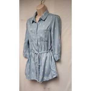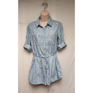 Intro. Womens Pineapple Print Tunic Blue Denim Blouse Button Shirt Size Small