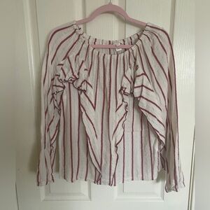 Long sleeve ruffle blouse with red stripes. Also has silver threading throughout. Good condition.