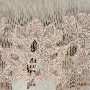 - Soft pink lace with scalloped edges and delicate contrast trim