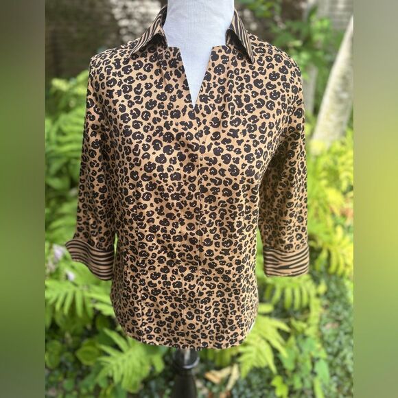 This Investments top showcases a bold leopard print in black and brown, complemented by a notched collar and 3/4 sleeves. The button-down design adds a touch of elegance, making it a versatile addition to any wardrobe.