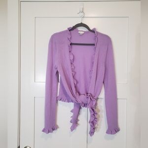 Investments Fine Cashmere ruffled open front cardigan in lavender color in size Small/Medium. 100% Cashmere dry clean. This is really soft & in great pre-owned condition with no tears, rips, holes or stains. Approx FLAT LAY measurements are: