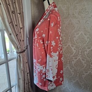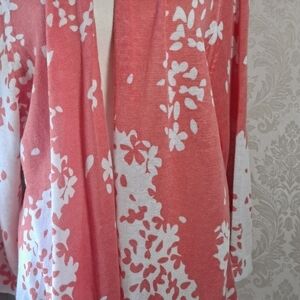 Beautiful peach and white Cardigan has an open front with no closure. Extra fabric around the back of the neck to adjust collar as you wish. long sleeves. Lightweight.
