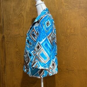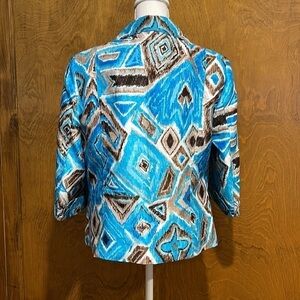 Beautiful turquoise, brown, and white Ikat print jacket/blazer. Three quarter length cuffed sleeves. Fully lined. Smoke free home.