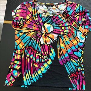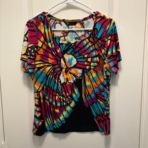 Bright/bold Investments Petites short-sleeve top in excellent condition (no flaws). Abstract floral/butterfly-wing look print with pops of teal, pink, orange, yellow, and black. Soft, stretchy knit fabric. 95% polyester, 5% spandex. Approx. measurements: pit to pit 19", shoulder to bottom 22".
