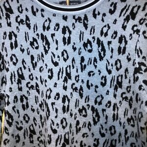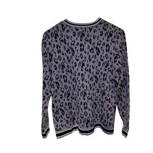 Keywords: animal print sweater, leopard print top, gray sweater, black sweater, pullover sweater, long sleeve sweater, crew neck sweater, button accent, petite size, investments petites, casual sweater, work sweater, stylish sweater, womens top