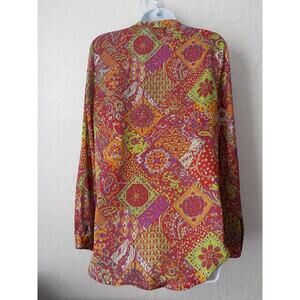 Investments Women 8 Satin Blouse V-Neck Button Up Colorful Boho Floral Bow Tie