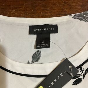 Investments XL Blouse Ivory Black Floral 3/4 Sleeve Round Neck Stripe Hem