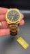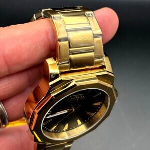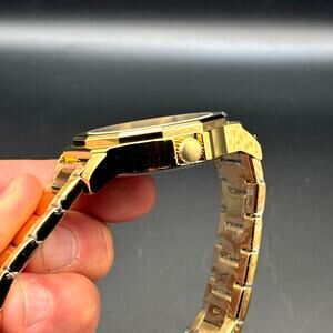 The gold tone stainless steel bracelet includes a fold over push button clasp for a secure fit. Water resistance is rated at 30 meters suitable for light splashes and daily wear.