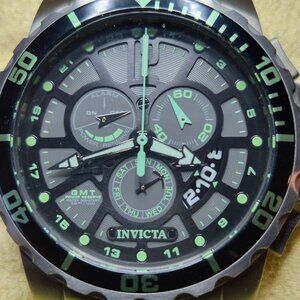Invicta, power reserve GMT edition watch. 44mm gunmetal grey case with matching mesh bracelet. Black and grey dial with green highlights. Time, date, GMT, alarm and power reserve, swiss quartz movement. Watch is in like new condition with new battery installed. Comes in original box with papers. GB23