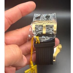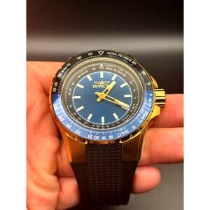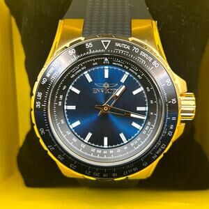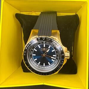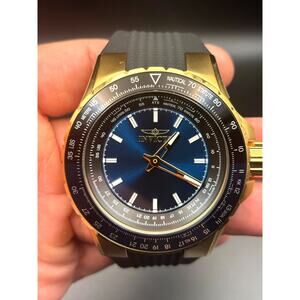 The Invicta Aviator model 49650 is a bold aviation inspired timepiece designed with precision driven styling and strong wrist presence. This watch features a gold tone stainless steel case paired with a deep blue dial and high contrast luminous hands and markers for excellent readability. The fixed bezel includes aviation conversion scales and flight reference markings, reinforcing its pilot watch aesthetic rather than a dive design.