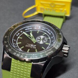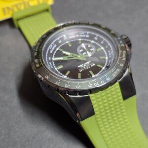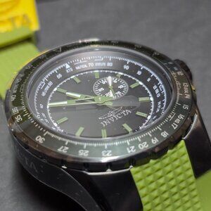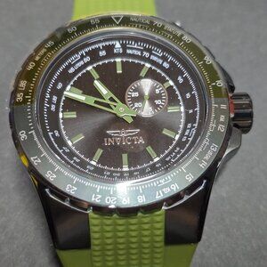 The Invicta Aviator 50mm Green Men's Watch 49733 is a stylish and durable wristwatch designed for casual wear. This quartz movement timepiece features a round case with a green color and a stainless steel material, water-resistant up to 100 meters. The watch comes with a two-piece silicone strap with a buckle closure, making it comfortable to wear. With a case size of 50mm, this watch is a perfect choice for men looking for a reliable and fashionable timepiece. The watch also comes with its original box and manual, adding to its value.