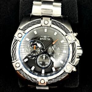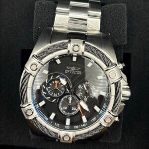 Invicta Bolt model 25512. Big, bold steel with the signature cable bezel and a clean black dial. The 52 mm stainless steel case uses a flame fusion crystal and a Japan quartz VD54 chronograph for reliable timing. Fixed stainless bezel with black and silver cable trim, push crown, and a solid steel bracelet. Water resistant to 100 meters for everyday wear.