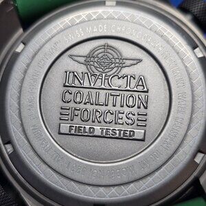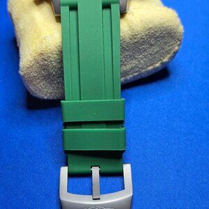 Invicta chronograph watch, model 0231. 50mm Titanium case with green dial. 19mm thick. Rotating inner bezel. New battery. Ronda 5040.D Swiss movement. Original green rubber strap had dried out and broken, replaced with new green silicone strap. Watch is in like new condition with no scratches. GB34