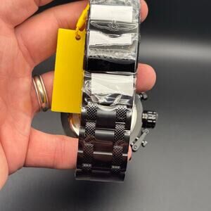 Invicta Coalition Forces model 32727. Mens black stainless steel watch with a 52 mm case, VD53 quartz chronograph, flame fusion crystal, screw down crown, and 100 meter water resistance. Black stainless bracelet is 26 mm wide and about 200 mm long with fold over safety clasp. Fixed stainless bezel in black with gunmetal and white accents. Dial is metal with luminous details. Photos show the actual watch, not stock. Any films may be lifted for pictures and then reapplied.
