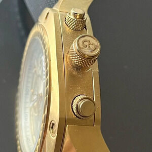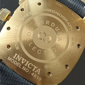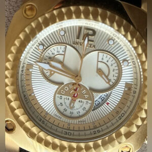 Invicta Córduba Collection model 4810 watch. This chronograph watch has a good tone case and a white face. It is water resistant up to 200 meters. The face has three dials and a gold tone #12. It measures 1.5” across the face. The band is a texture material on top and smooth leather underneath and it measures 10”. There is a small defect on the band (see picture). The watch crystal is in perfect condition.