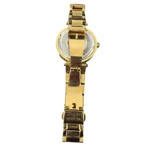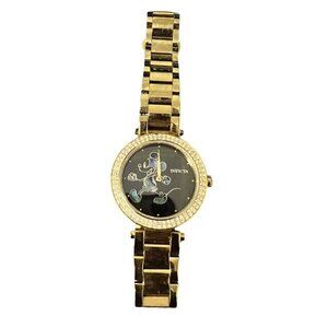 Limited Edition women's watch features a 38mm wide and 13mm thick yellow gold plated solid stainless steel case with 120 crystals accented bezel and textured push-pull crown. Powered by a reliable Japanese TMI VJ20 quartz movement. Features Mickey mouse abalone enamel sharp looking black dial with gold tone luminous hands and dot hour markers, scratch resistant flame fusion crystal and water resistant. Equipped with an 18mm wide yellow gold plated solid stainless steel bracelet with a fold over push button clasp.