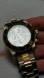 Stylish chronograph watch with a gold and silver bracelet. Features a detailed black dial.